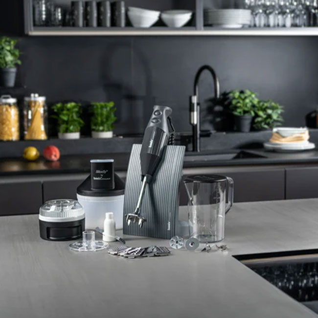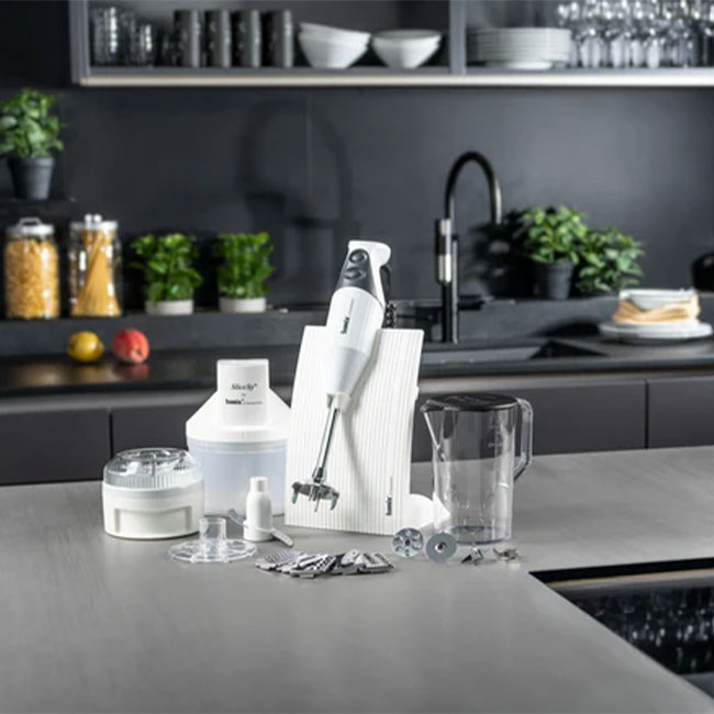 اسلایسر ,پارچ مخصوص بامیکس ,پایه/استند رومیزی ,خردکن ,همراه با یک تیغه همه کاره و 3 تیفه قابل تعویض |