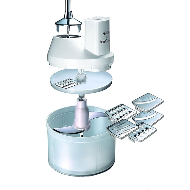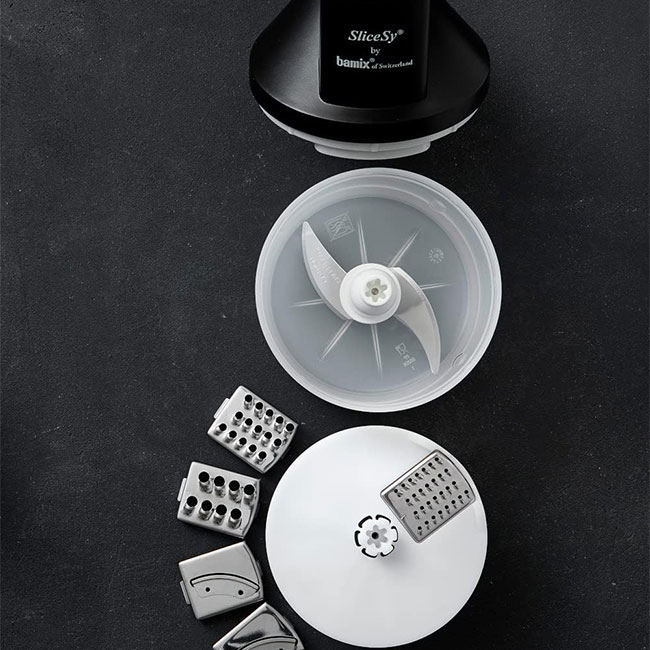 ۱ عدد تیغه برش (اسلایس) ,۱ عدد محفظه/ظرف باکیفیت SliceSy ,۵ عدد تیغه (ریز، متوسط، درشت، رنده نواری ژولین و ورقه کن ریز و درشت) |
